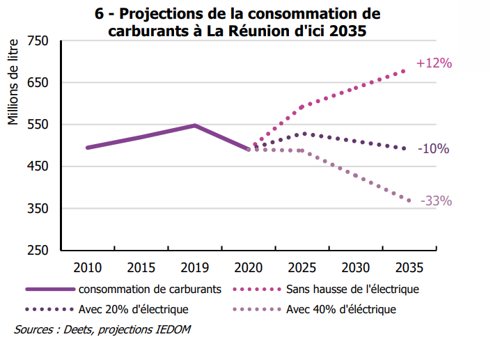 D’ici 2035, les projections de l’IEDOM indiquent une baisse de 10 % à 33 % des ventes de carburants par rapport à 2019, selon la pénétration des véhicules électriques dans le parc de La Réunion, anticipé entre 20 % et 40 %. Le maillage territorial en stations-service de l’île va donc évoluer au cours des prochaines années.