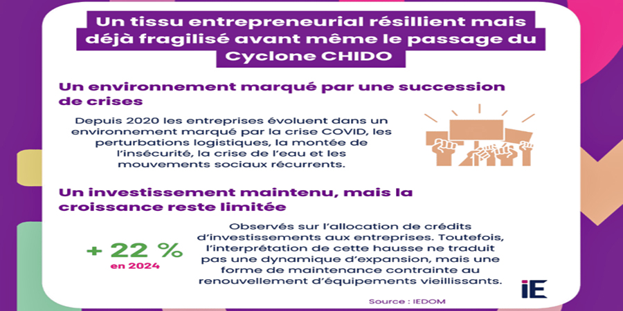 « Sur le plan financier, les constats étaient également préoccupants avec des recours massifs au crédit à court terme pour financer l’exploitation, des tensions extrêmes sur les trésoreries, une hausse rapide des créances douteuses et un investissement qui se maintient, mais n’est plus un levier de croissance. L’arrivée du cyclone est donc intervenue dans un contexte où les capacités du territoire et les marges d’absorption des entreprises et des banques étaient déjà fortement sollicitées. Tout choc exogène, même de dimension plus limitée que Chido, aurait été susceptible de déstabiliser le tissu entrepreneurial », constate l’IEDOM.
