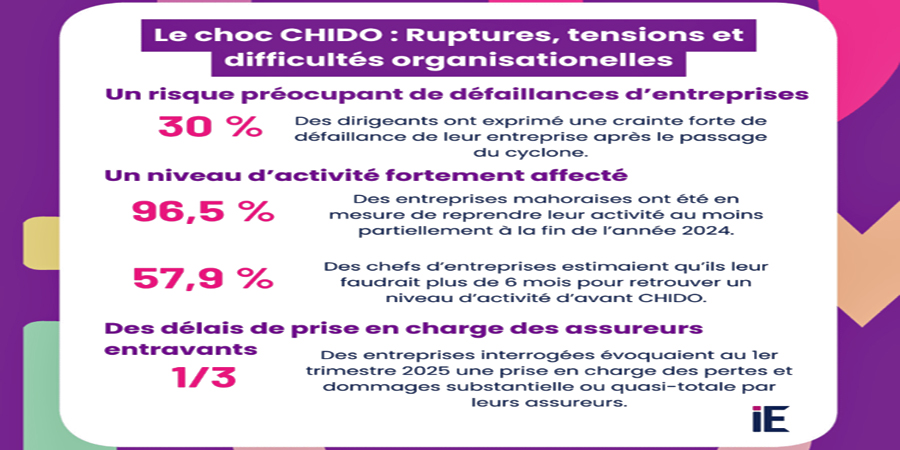 Lors d’une enquête menée au premier trimestre 2025, la totalité des secteurs sollicités par l’IEDOM déclaraient avoir subi des difficultés organisationnelles et des dégradations importantes (outils de production, surfaces de vente, bureaux, véhicules professionnels, locaux de stockage, etc.). Malgré tout, « dès fin décembre 2024, 96,5% des entreprises interrogées annonçaient avoir été en mesure de reprendre ou de poursuivre leur activité au moins partiellement. Parmi elles, 42,1% estimaient avoir retrouvé le même niveau qu’avant Chido », relève l’étude.