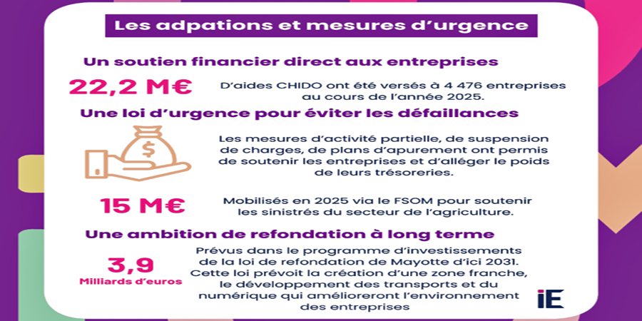 « La situation des entreprises avant Chido a mis en évidence un tissu productif dont les marges de manœuvre étaient presque entièrement épuisées. La loi d’urgence Mayotte répond à ces vulnérabilités et vise à sécuriser la continuité économique du territoire », souligne l’IEDOM. Cette loi répond aux besoins immédiats provoqués par le cyclone, mais son action reste limitée au court terme, en soutenant la continuité d’activité et la stabilisation du tissu productif. Les fragilités structurelles, déjà présentes avant l’événement, exigent quant à elles une approche plus large et de plus longue portée. C’est dans cette logique qu’intervient la loi de programmation pour la refondation de Mayotte, promulguée en août 2025, qui ambitionne de transformer en profondeur l’environnement économique et social du territoire.