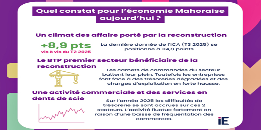 Qu’en est-il aujourd’hui de la conjoncture économique mahoraise ? Selon l’étude, le climat des affaires repose essentiellement sur les travaux de reconstruction, le secteur du BTP en étant évidemment le premier bénéficiaire. « Cependant, l’activité du secteur connaît aujourd’hui un fléchissement, et ce, malgré des carnets de commandes qui demeurent remplis. Les trésoreries des entreprises du secteur sont à un niveau très faible et les charges d’exploitation accusent une forte hausse. Cette évolution serait imputable, en grande majorité, au fait que les entreprises aient avancé les frais de réparation de leur outil productif en attendant une prise en charge par les compagnies d’assurance », précise l’IEDOM.