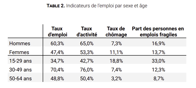 Les jeunes de 15 à 29 ans restent la catégorie d’âge la plus éloignée du travail : 34,7% d’entre eux sont en emploi, et 44,1% sont classés comme « inactifs ne souhaitant pas travailler », contre 33,2% en 2018. 18,8% d’entre eux sont au chômage, c’est-à-dire qu’ils cherchent activement du travail et se rendent disponibles. Les 50 à 64 ans sont eux aussi très nombreux à se déclarer inactifs ne souhaitant pas travailler (plus de 45%), mais sont très peu au chômage au sens strict du terme (3,2%).