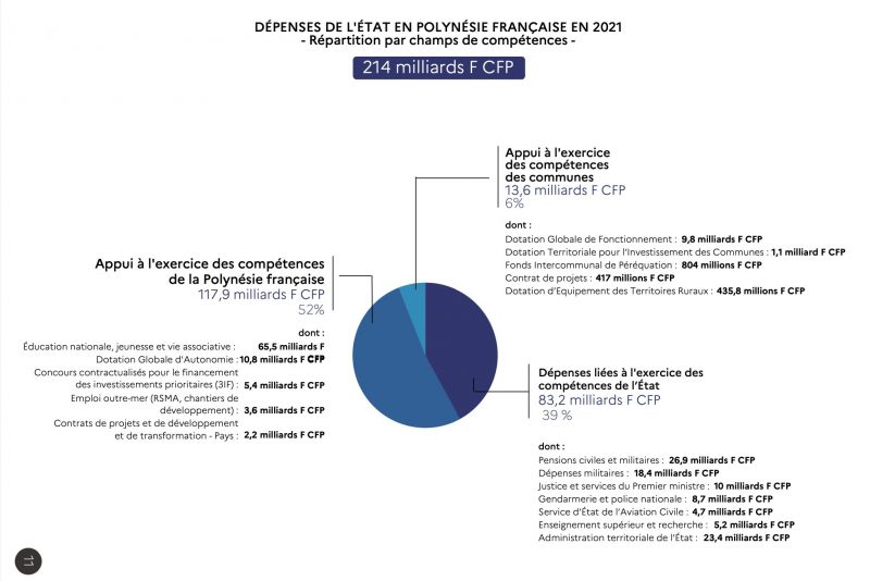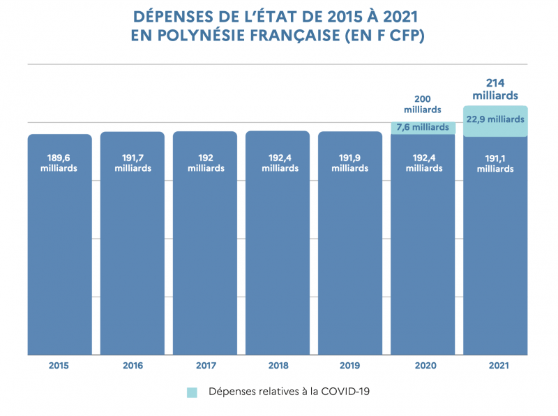 Ainsi, en 2021, l’État a dépensé 214 milliards de francs dont 22,9 milliards directement liés à la crise sanitaire. Le « socle » des dépenses reste stable, passant de 192,4 milliards en 2020 à 191,1 milliards en 2021. On y retrouve trois grands blocs : le salaire des fonctionnaires d’État (dans lequel est compté celui des enseignants du 1er et 2nd degrés des secteurs publics et privés, soit 5 500 personnes), les dotations de fonctionnement au Pays et aux communes et les dépenses d’appui d’investissement pour l’équipement.