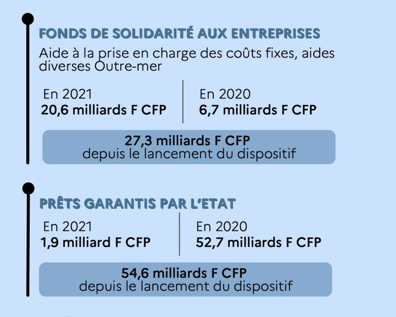 Du côté du secteur privé, 8,4 milliards de francs d’aide fiscale ont été attribués en faveur de 14 programmes dans le cadre de la défiscalisation nationale. Elle touche plusieurs secteurs : le transport maritime, le tourisme, l’industrie, la concession de service public ou encore la pêche. 2021 a été marquée par le montant de l’aide « au titre de la solidarité nationale » pour affronter la crise sanitaire. 22,9 milliards ont été dépensés par l’État pour soutenir le tissu économique, à travers le Fonds de solidarité aux entreprises (20,6 milliards en 2021) et les prêts garantis par l’État (1,9 milliard en 2021), des crédits engagés dans les domaines de l’industrie et de la culture, des avances remboursables et des prêts à taux bonifié et des liquidités apportées aux banques. « La Polynésie française est la collectivité d’outre-mer la plus largement bénéficiaire du fonds de solidarité ».