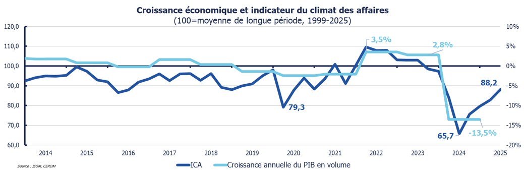 Après un plus bas historique enregistré au second trimestre 2024, l’Indicateur du climat des affaires (ICA), mesuré par l’IEOM, poursuit son redressement pour atteindre 88,2 au second trimestre 2025 (+22,5 points sur un an). Ce redressement de l’ICA ne peut être interprété comme un signe de reprise de l’économie, mais comme celui d’une stabilisation de celle-ci à un niveau particulièrement dégradé. La dernière enquête de conjoncture s’est déroulée entre fin juin et fin juillet, au moment de la signature du projet d’accord de Bougival et avant l’annonce du retrait de l’un des groupes politiques signataires.