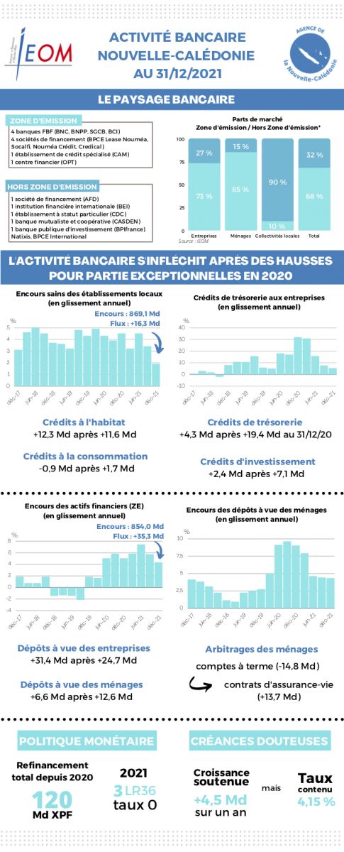 Le second, si l’année 2021 a amorcé un retour timide à la normale, elle n’en était pas moins impactée par un lot d’incertitudes fortes : poursuite de la crise sanitaire, contexte économique morose après un an de crise mondiale, et localement, forte incertitude institutionnelle liée au 3e référendum d’autodétermination. Il en résulte un ralentissement global, avec une activité de crédit moins dynamique, notamment en raison d’un moindre recours des entreprises au PGE et le gel de certains projets d’investissement.
