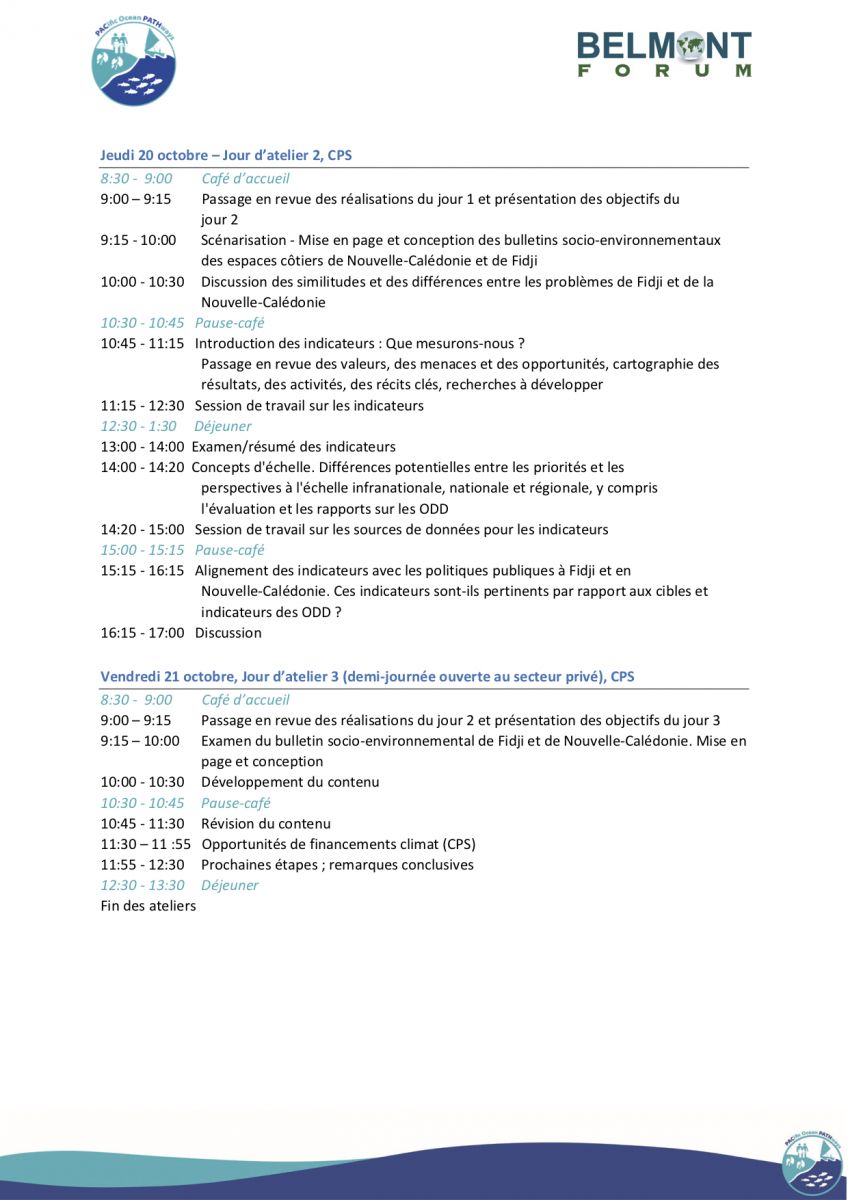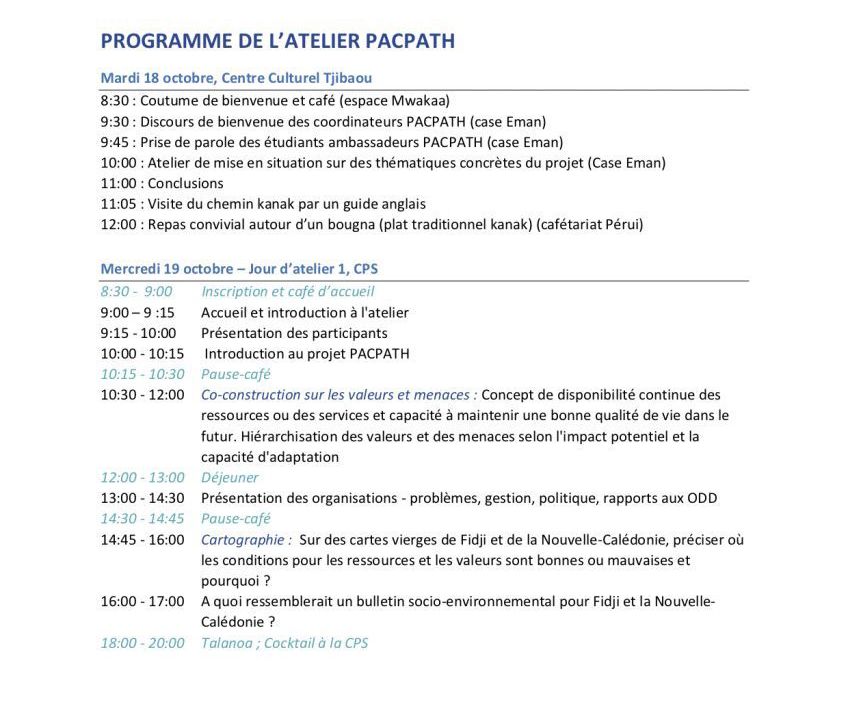 Le projet PACPATH, financé par le Forum Belmont et coordonné localement par l’IRD, a pour objectif de « déterminer des leviers d'action qui permettront de mettre en place des trajectoires de durabilité à Fidji et en Nouvelle-Calédonie ». « L’atelier de cette semaine est une étape cruciale du projet et les participants mettrons leurs connaissances et expériences en commun afin de parvenir à une compréhension commune des attributs, ressources et services les plus importants de l'océan et des espaces côtiers ; et de co-concevoir un bulletin socio-environnemental qui permettra la mise en œuvre trajectoires établir une feuille de route avec des groupes d'intérêts pour financer des recherches et des actions cohérentes pour faire face à l'érosion côtière, à l'élévation du niveau de la mer, aux vagues de chaleur marine, à l'acidification et à la désoxygénation des océans ».