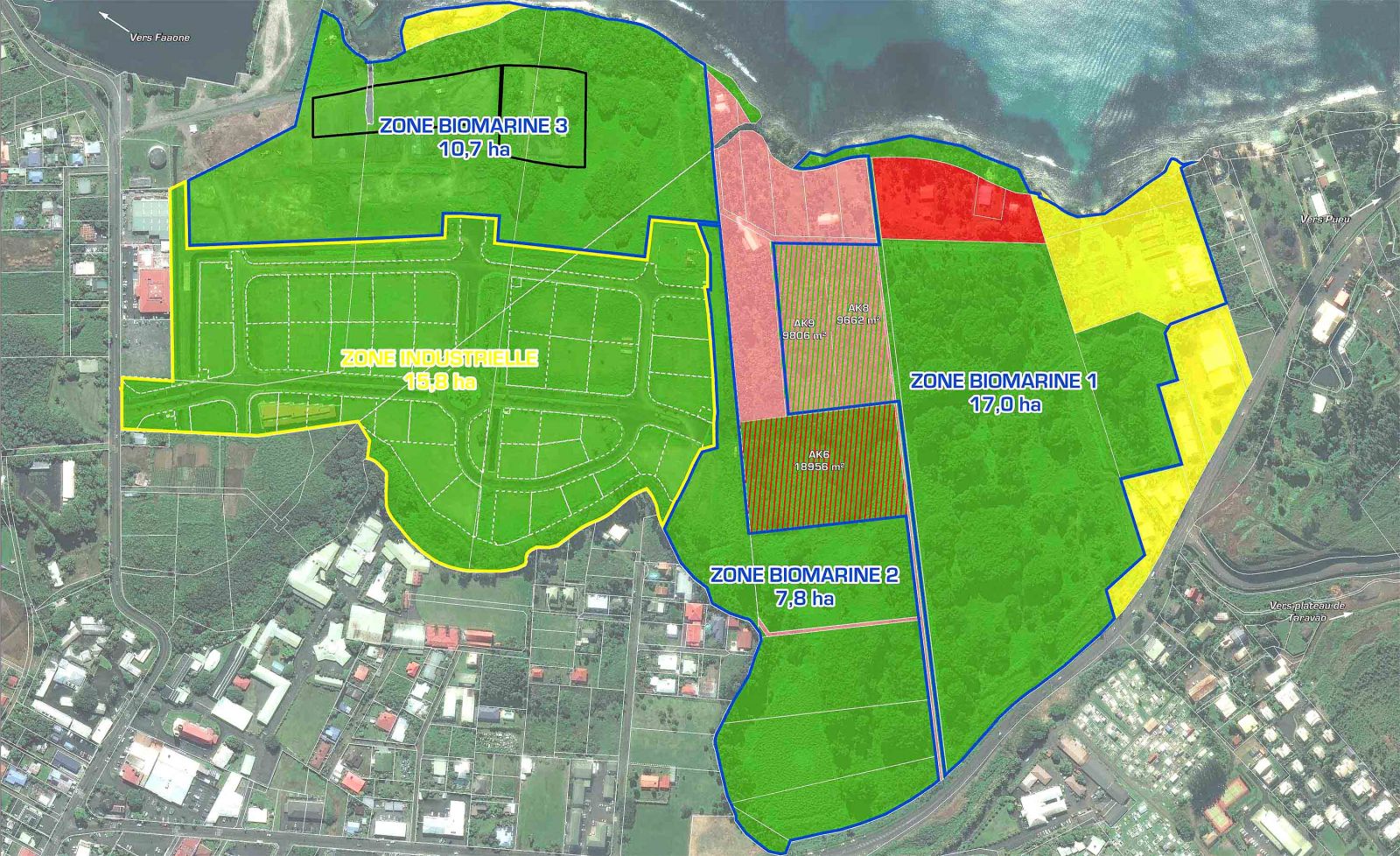 La zone BIOMARINE est un projet d’aménagement public d’infrastructures d’aquaculture communes sur une superficie de 33 hectares située à Faratea, et dans laquelle les parcelles seront louées à de futurs exploitants, présélectionnés sur les projets spécifiques suivants : crevette, holothurie, huître de roche, bénitier, larves de mouche, aliment aquacole. L’objectif à terme est d’y développer des solutions fondées sur la nature, en s’appuyant entre autres sur des techniques de bio-remédiation, récentes en milieu tropical. Pour ce faire, la DRM a lancé un projet d’algoculture cofinancé par PROTEGE (Fonds Européen de Développement).