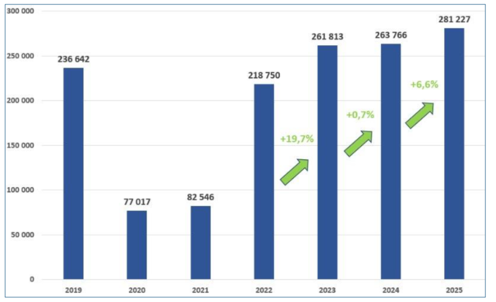 Record en 2023, 2024 et désormais 2025. Avec un total de 281 227 touristes accueillis l’an passé, la destination « Tahiti et ses îles » a ainsi franchi le seuil symbolique d’un touriste par habitant. Cette hausse de 6,6% par rapport à 2024 s’observe sur tous les marchés émetteurs, sauf la Nouvelle-Zélande.