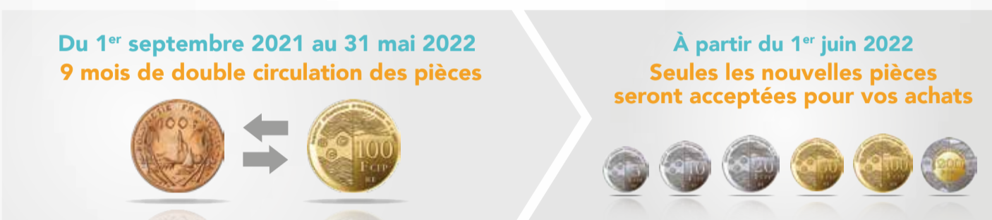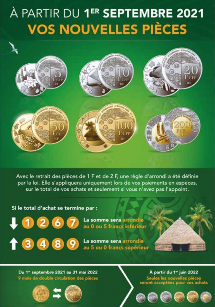 L’IEOM nous dévoile la composition de la nouvelle gamme de pièces en franc Pacifique, qui sera mise en circulation à compter du 1er septembre 2021 au sein des 3 collectivités du Pacifique : Nouvelle-Calédonie, Polynésie française et les îles Wallis-et-Futuna.