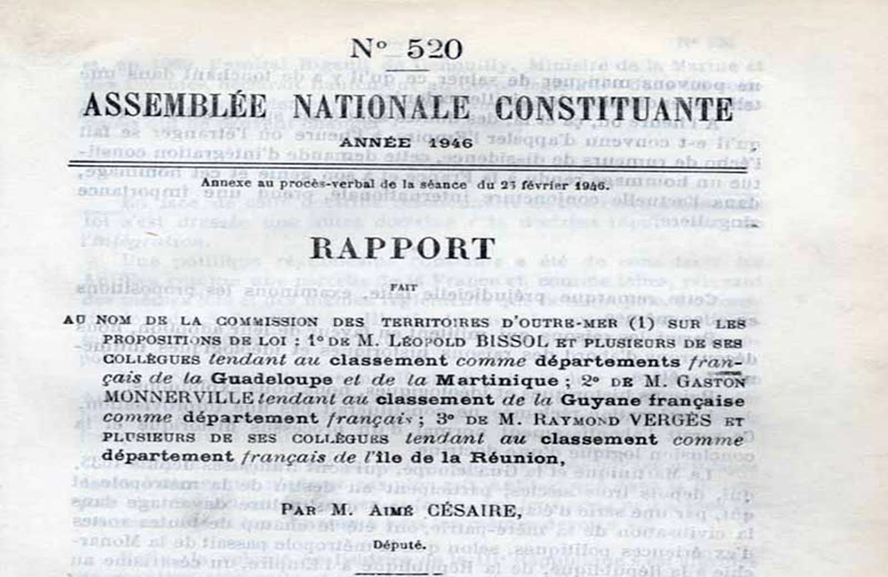 La loi de départementalisation résulte de la fusion de quatre propositions distinctes : l’une déposée par Léopold Bissol pour la Martinique, une autre par Gaston Monnerville pour la Guyane, une troisième par Raymond Vergès pour La Réunion, et la dernière par Eugénie Éboué-Tell pour la Guadeloupe. Aimé Césaire est chargé d’en rédiger le rapport.