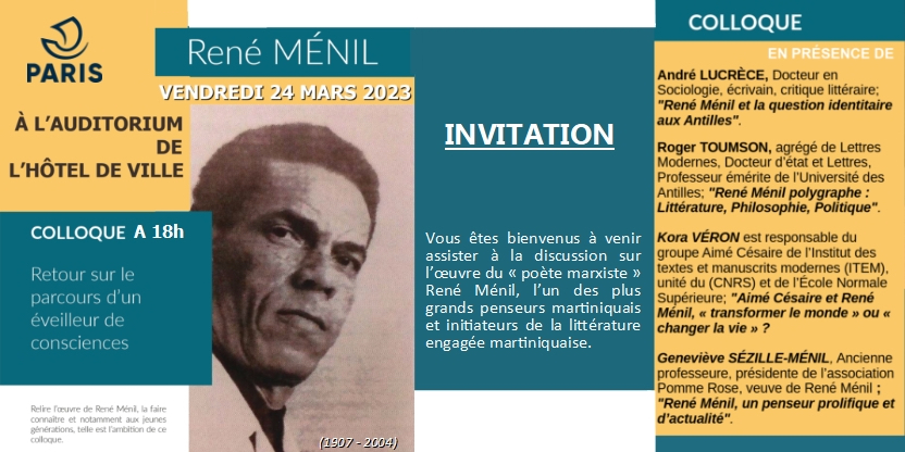 Connu pour ses écrits militants, René Ménil fut avec Aimé Césaire, « une grande figure de la révolution culturelle qui, aux Antilles françaises au lendemain de la Seconde guerre mondiale, dans l’ordre de l’histoire politique, de l’histoire des idées, a disqualifié les bases du système esclavagiste », selon Roger Toumson qui fera partie tout comme André Lucrèce, de Kora Véron, auteure de la plus importante biographie de Césaire et bien sûr de Geneviève Sézille Ménil des intervenants au colloque de Paris.