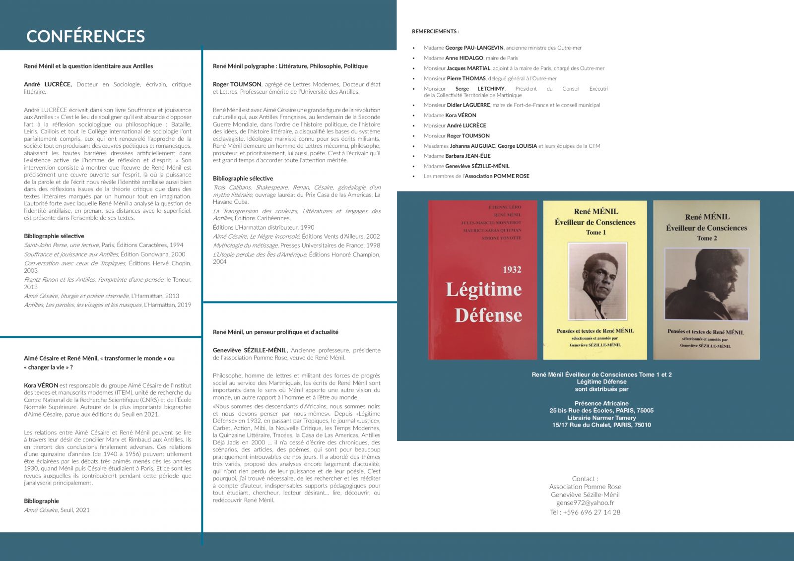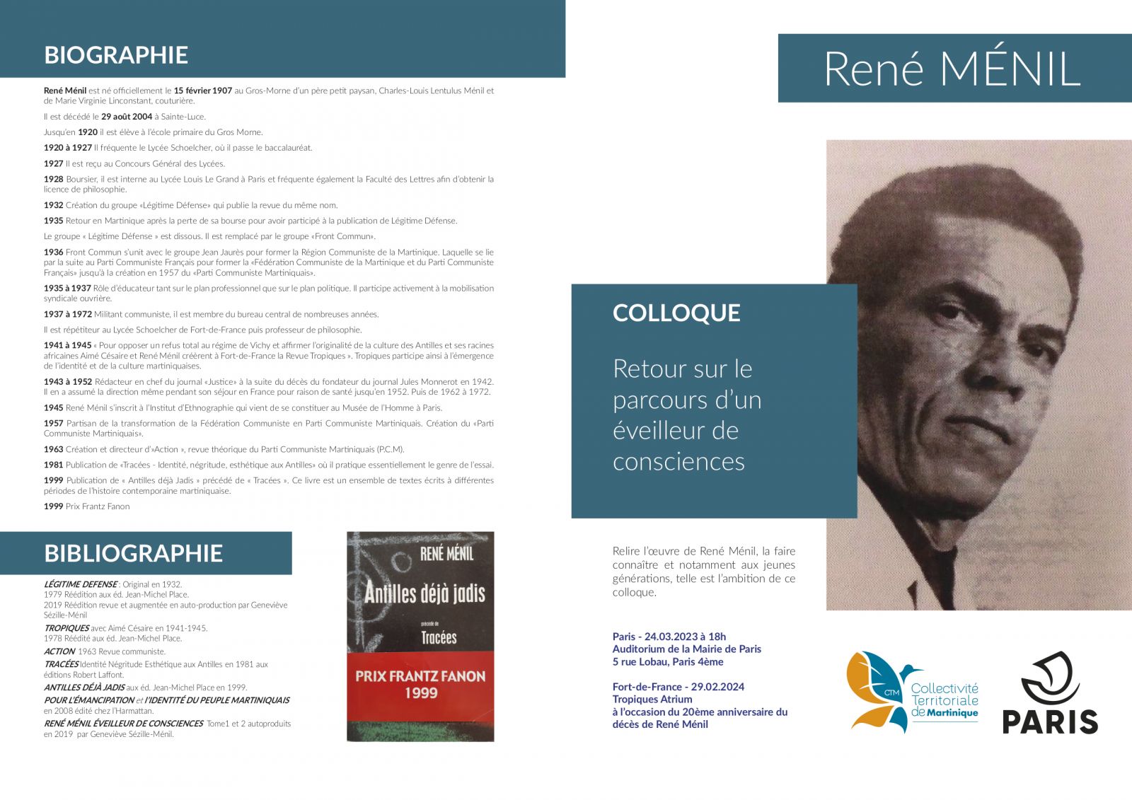 Après avoir autoproduit en 2019 en 2 tomes les écrits de René Ménil sous le titre « René Ménil éveilleur de consciences », Geneviève Sézille-Ménil s’est attelé à la tenue d’un colloque le 24 mars 2023 à Paris (avant celui qui se déroulera en Martinique en février 2024 à l’occasion du vingtième anniversaire de la mort de René Ménil) autour de l’œuvre et les combats de celui qui affirmait « nous sommes des descendants d’Africains, nous sommes noirs et nous devons penser par nous-mêmes ».