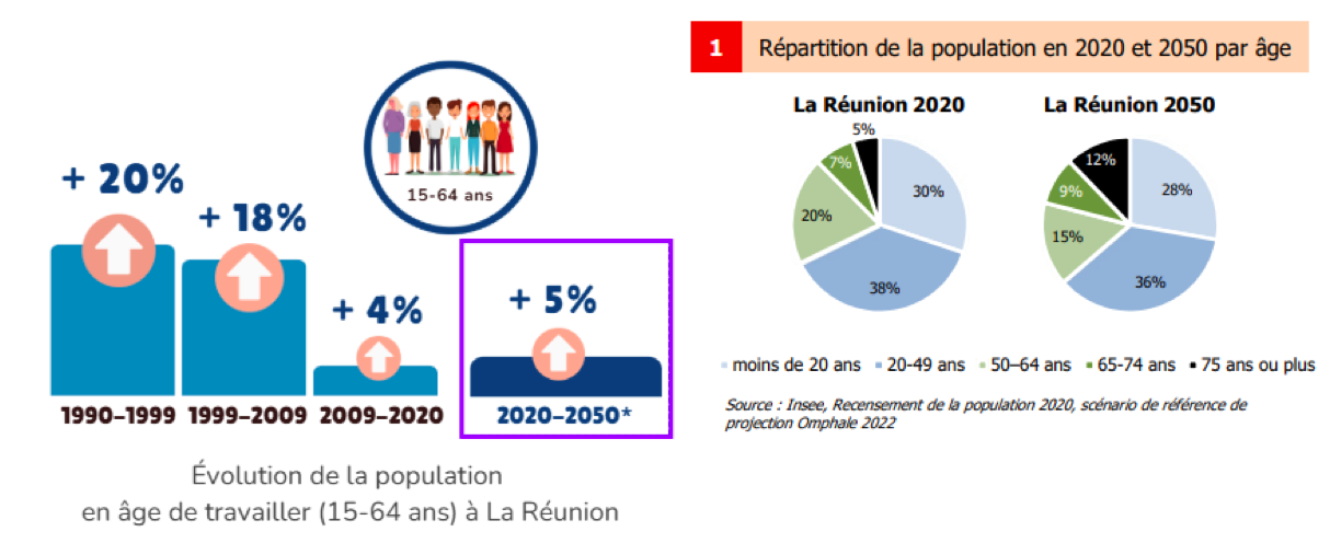 Le vieillissement de la population réunionnaise aura un impact direct sur le marché du travail. La population en âge de travailler (15-64 ans) n’augmentera que de 5 % d’ici 2050, de 564 000 à 594 000 personnes. Entre 1990 et 2009, la population en âge de travailler avait augmenté de 20 % par décennie, avant de ralentir à +4 % entre 2009 et 2020. Cette progression limitée, bien inférieure à celle de la population totale (+15 %), devrait réduire la pression démographique sur le marché du travail. Toutefois, la part de la population active dans la population totale devrait diminuer.