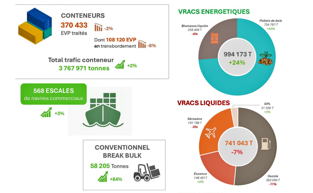 En ce qui concerne les vracs, la tendance est plus nuancée. Les vracs liquides reculent tandis que les vracs solides poursuivent leur progression. Avec un peu plus d’un million de tonnes, les liquides diminuent de 7,1%, un repli principalement lié à une baisse de 6,6% de la demande en kérosène. Cette consommation dépend fortement de la fréquentation touristique et des choix des compagnies aériennes concernant leur lieu d’approvisionnement. Le gazole enregistre quant à lui aussi une contraction de 11%. La biomasse liquide utilisée pour le chauffage perd du terrain, reculant de 6% à 259 406 tonnes. Seule l’essence sans plomb affiche une hausse en 2025, avec une progression de 4,1%.