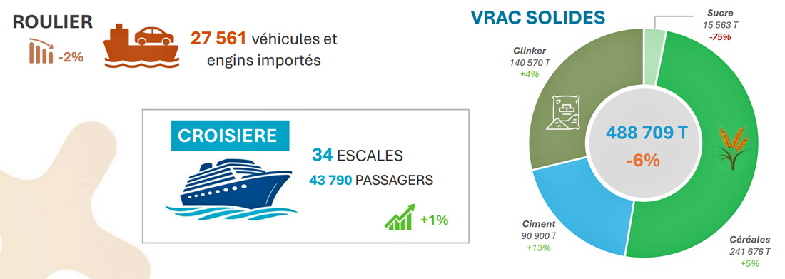 Par ailleurs, les marchandises diverses, hors conteneurs, repartent à la hausse. Elles clôturent l’année avec 58 205 tonnes, soit une progression de 84% sur un an. Ces flux regroupent notamment des équipements destinés aux filières du BTP, de l’agriculture et de la distribution.