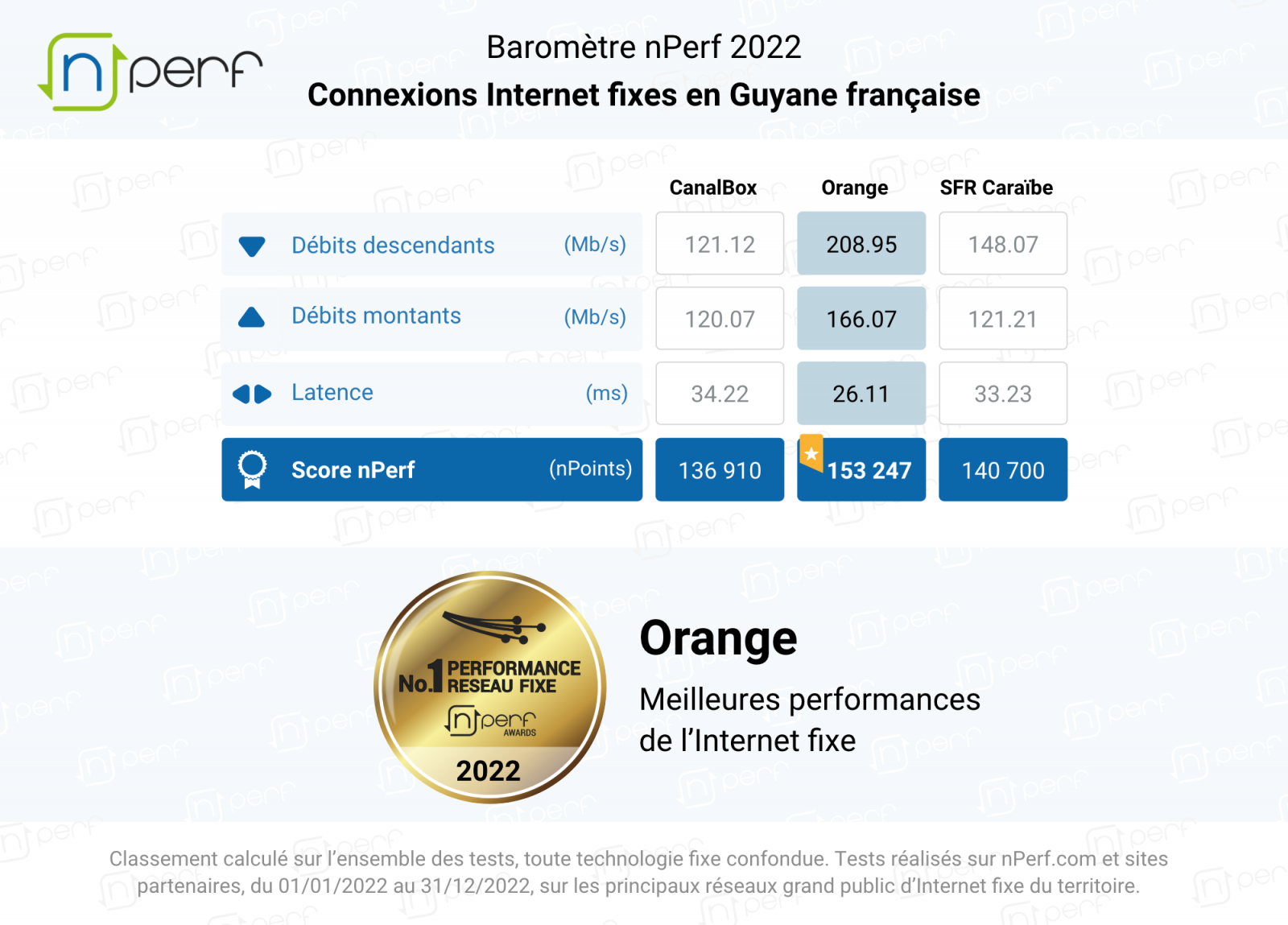 En Guyane, Orange domine le marché sur tous les indicateurs, même si le rapport note que dans le secteur du haut débit le fournisseur recule légèrement au score, suite à une légère baisse de ses débits et un allongement de son temps de réponse, tandis que pour le très haut débit, l’opérateur CanalBox obtient une première place ex-aequo.