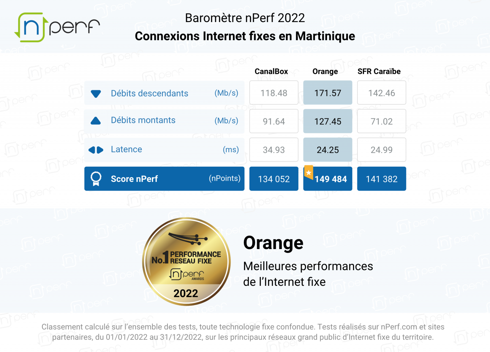 Basée à Lyon, la société nPerf est spécialisée dans l’étude et la mesure de la qualité des connexions internet. Ce lundi 27 février 2023, elle a publié une étude de l’année 2022, baromètre des connexions internet fixes dans les Antilles et en Guyane française. L’étude met en avant la nette supériorité de l’opérateur Orange sur l’ensemble des territoires étudiés, la Guadeloupe, la Martinique et la Guyane.