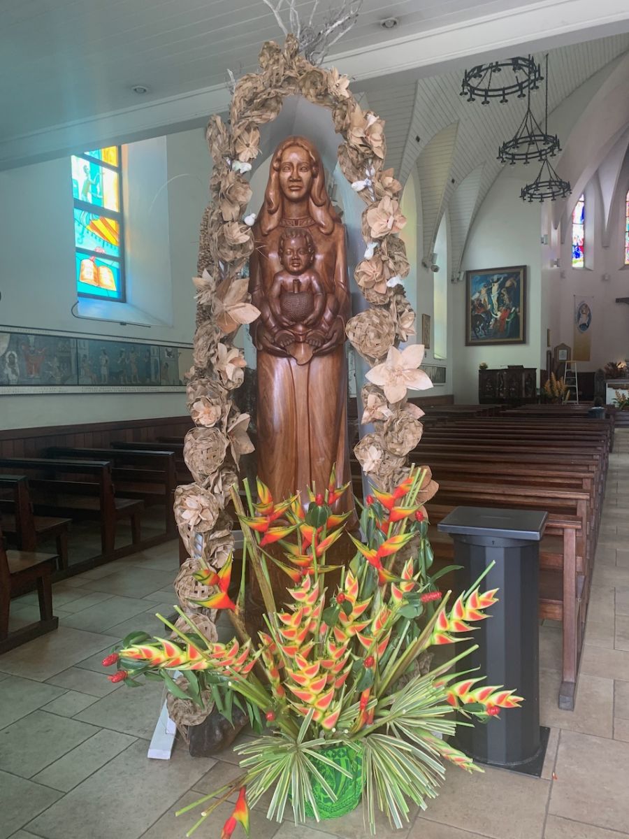 Transformée au fil des décennies, la cathédrale s’est aussi progressivement « polynésianisée ». « Dès les années 60, quand il y a eu les travaux de la cathédrale, tu as le baptistère qui commence déjà à prendre une couleur plus polynésienne, et puis viennent les vitraux réalisés par Deanna de Marigny, mais aussi une copie du tableau de Rubens, refaite en 2000 par le peintre Ioane », raconte Père Christophe. » Il l’a polynésianisé, parce que Rubens c’est très sombre, mais là il y a des couleurs. Et puis ensuite, on a aussi la Vierge marquisienne à l’entrée. »