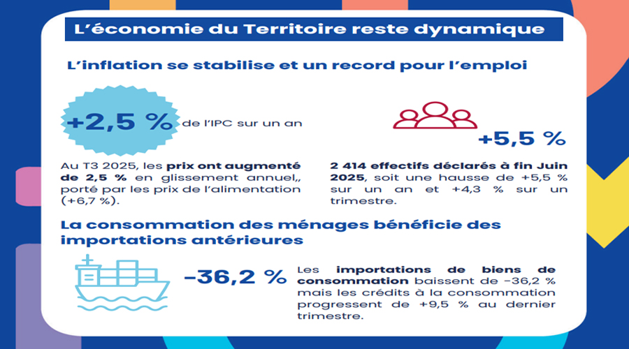 Sur le plan de l’emploi, la tendance est au vert pour le trimestre concerné (+4,3% soit plus de 100 salariés), de même que pour l’année 2025 (+5,5%, soit plus de 125 salariés). « Cette progression est principalement portée par le secteur privé, avec une croissance de 11,9% des emplois en glissement annuel, contre seulement +0,8% pour le secteur public sur la même période ». Cette dynamique est principalement importante pour le BTP et les services, qui enregistrent chacun une croissance de 15,7% sur un an. Ils sont suivis par l’industrie et l’artisanat (+11,8%) et le commerce (+7,6%). Le secteur public demeure prépondérant avec 55% de la totalité des emplois.